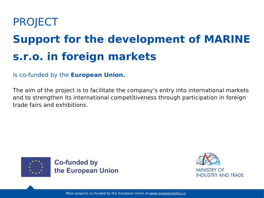 In June 2025, a Grant Award Decision was issued for the project „Support for the development of MARINE s.r.o. in foreign markets,“ which is aimed at facilitating participation in international trade fairs and exhibitions.